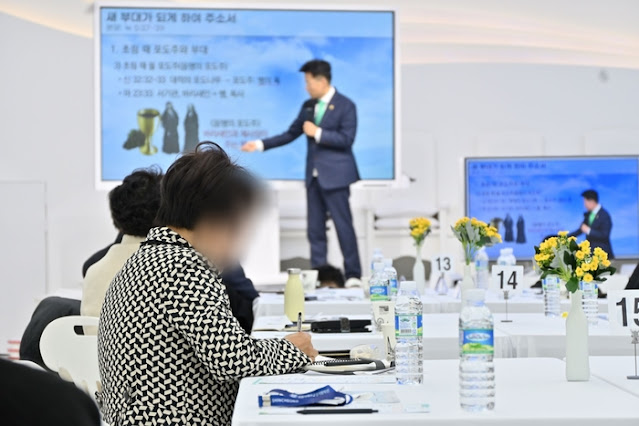 | On the 21st, at the Shincheonji Yeongdeungpo Church, a pastor is praying before the start of the '2024 Vision Conference for Pastors' held by the Shincheonji Bartholomew Tribe. |