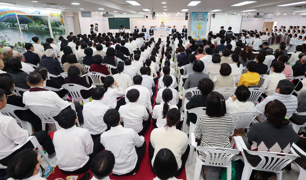 | At the Bible seminar held at the Shincheonji Jeju Church on the 18th, the congregation, pastors, and other audience members are focusing on the lecture of Chairman ManHee Lee |